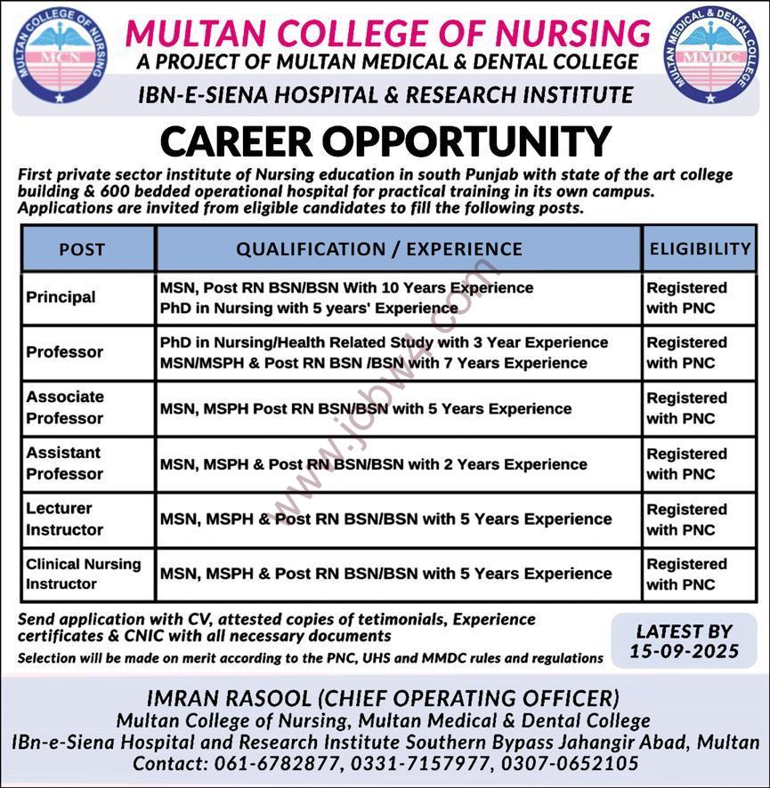The Multan College of Nursing jobs in Pakistan 2025 include positions for teaching, administrative, and support staff. Some of the main posts may include: