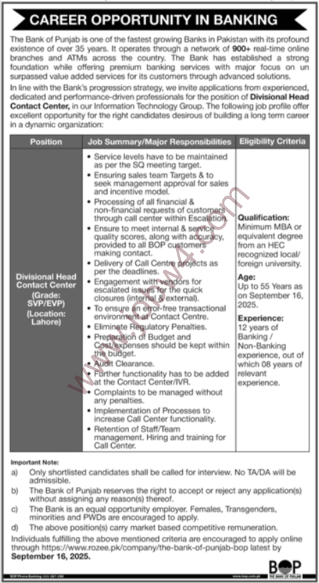 Tagged as: Bank of Punjab BOP job advertisement 2025, Bank of Punjab jobs 2025, Bank of Punjab Lahore jobs 2025, Bank of Punjab vacancies 2025, Banking jobs in Peshawar 2025, BOP jobs in Pakistan Peshawar 2025, BOP Lahore jobs Peshawar 2025 online apply, BOP latest jobs in Peshawar 2025, Government bank jobs in Pakistan 2025, Govt Jobs in Peshawar 2025, How to apply for Bank of Punjab jobs in Peshawar 2025, New govt jobs 2025 in BOP