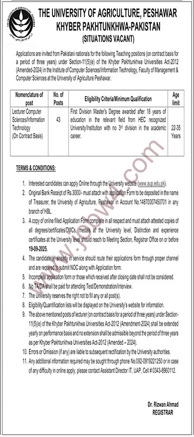 If you are looking for govt jobs 2025 in Pakistan, here is a golden opportunity. The University of Agriculture, Peshawar has announced new jobs 2025 for the post of Lecturer in Computer Sciences and Information Technology. This is a contract-based teaching position but offers growth, stability, and a chance to be part of a leading educational institution.